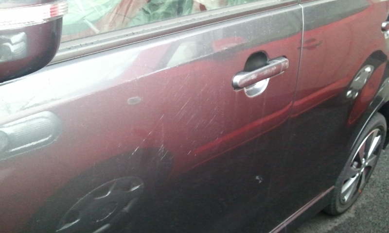 一昨日の嵐の影響で展示車に傷がついてました。